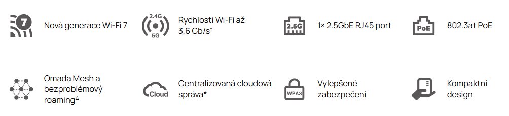 ‡Využití Wi-Fi 7 (802.11be) a funkcí včetně šířky pásma 160 MHz, MLO, 4K-QAM, Multi-RUs, OFDMA a MU-MIMO vyžaduje, aby klienti podporovali odpovídající funkce.