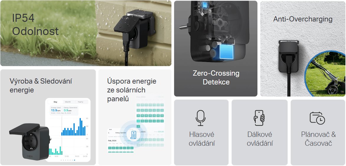 Chytrá venkovní zásuvka TP-Link Tapo P410M nabízí spolehlivé ovládání napájení, monitoring spotřeby i integraci s nejrozšířenějšími ekosystémy díky certifikaci Matter. Odolnost proti povětrnostním vlivům IP54, monitorování solární energie, hlasové ovládání a bezpečnostní prvky jako ochrana proti přetížení, přehřátí a dětská pojistka dělají z této zásuvky ideální řešení pro každou chytrou domácnost – uvnitř i venku.