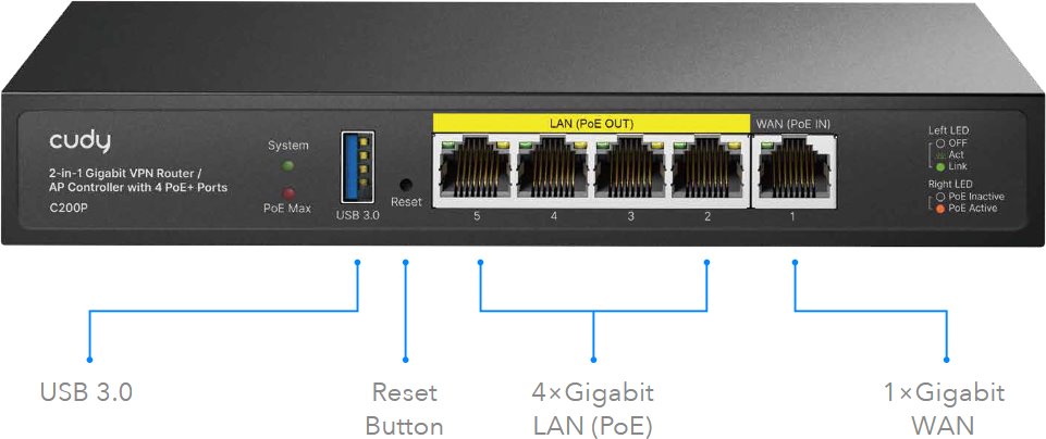 Gigabitový router s vestavěným AP Controllerem umožňuje snadnou správu rozsáhlé mesh sítě tvořené Access Pointy značky Cudy. Zařízení slouží zároveň jako PoE switch se 4mi porty s celkovým PoE budgetem 55 W a nabízí flexibilní napájení přes DC jack nebo pasivní PoE (24/48V). Nechybí podpora široké škály VPN a 1x Gigabit WAN port pro spolehlivé připojení k internetu.