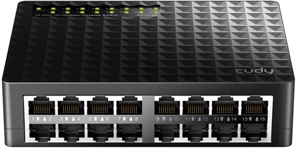 Nemanagovatelný 16portový 10/100 Mbps switch jednoduchým a moderním designem od výrobce Cudy. Tento produkt se vyznačuje kompaktními fyzickými rozměry, nízkou energetickou spotřebou a jednoduchou instalací plug-and-play bez jakéhokoliv nastavování. Switch má plastové šasi, LED indikaci připojených portů a je ideálním řešením pro domácí prostředí, kde je potřeba rozšířit stávající síť a připojit k ní více zařízení, jako například stolní počítače, tiskárny, IP kamery, chytré televize, herní konzole a jiné.