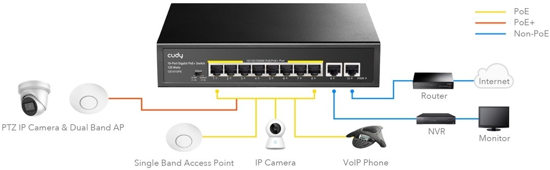 Gigabitový PoE switch bez managementu s pevným kovovým jednoduchým šasi s 10x Gigabit LAN porty je ideální PoE switch do domácností a rodinných domů pro napájení až 8 zařízení (kamer / Wi-Fi AP). Switch nabízí tichý chod bez ventilátorů, 10x 10/100/1000 Mbps z čehož 8 portů podporuje funkci PoE (802.3af/at - 30 W / port) s celkovým PoE budgetem 120 W, nízkou vnitřní spotřebou a napájením přes 230V AC konektor díky věstavěnému zdroji.