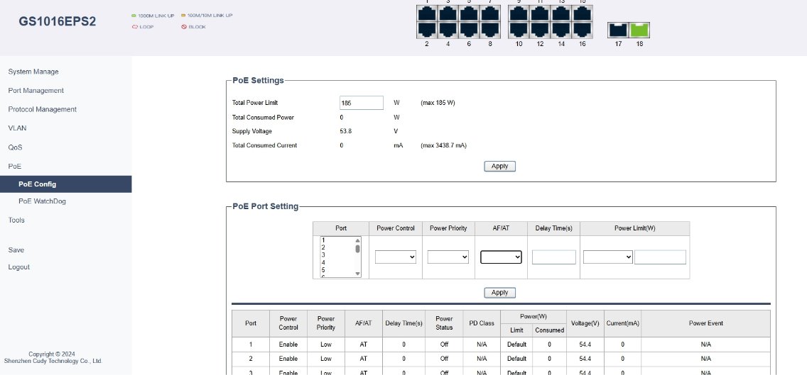 Pokročilé možnosti řízení umožňují detailní nastavení priorit PoE, limitů výkonu i chování jednotlivých portů. Funkce PoE Auto Recovery s watchdogem automaticky restartuje napájení při zamrznutí zařízení, čímž minimalizuje výpadky. Samozřejmostí je webová správa a SNMP, podpora VLAN, QoS, agregace portů, STP/RSTP i ochranné mechanismy jako DHCP snooping a IGMP Snooping. Výsledkem je flexibilní, bezpečná a snadno ovladatelná síť připravená na náročný provoz.