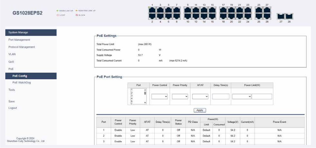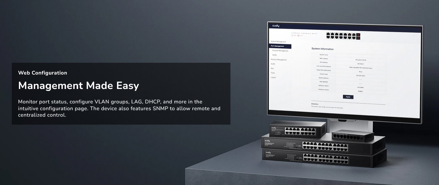 Pokročilé možnosti řízení umožňují detailní nastavení priorit PoE, limitů výkonu i chování jednotlivých portů. Funkce PoE Auto Recovery s watchdogem automaticky restartuje napájení při zamrznutí zařízení, čímž minimalizuje výpadky. Samozřejmostí je webová správa a SNMP, podpora VLAN, QoS, agregace portů, STP/RSTP i ochranné mechanismy jako DHCP snooping a IGMP Snooping. Výsledkem je flexibilní, bezpečná a snadno ovladatelná síť připravená na náročný provoz.