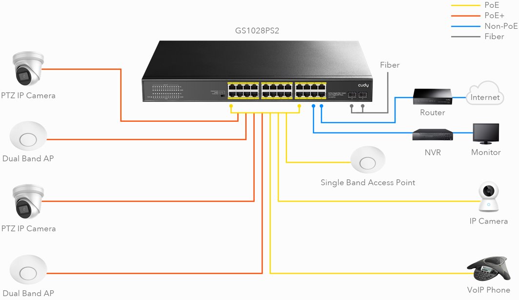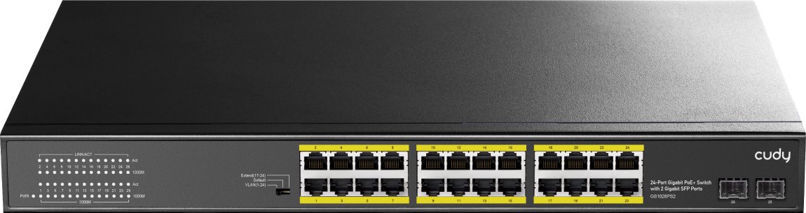 Switch má na přední straně přepínač mezi možnostmi Default, VLAN a Extend. Extend umožňuje PoE na vzdálenost 250 m (porty 17 až 24) při snížení linkové rychlosti na 10 Mbps, což pro přenos obrazu z kamer bohatě stačí. Možnost VLAN izoluje porty (porty 1 - 24) tak, aby připojené zařízení nemohli komunikovat mezi sebou ale pouze s uplink portem.