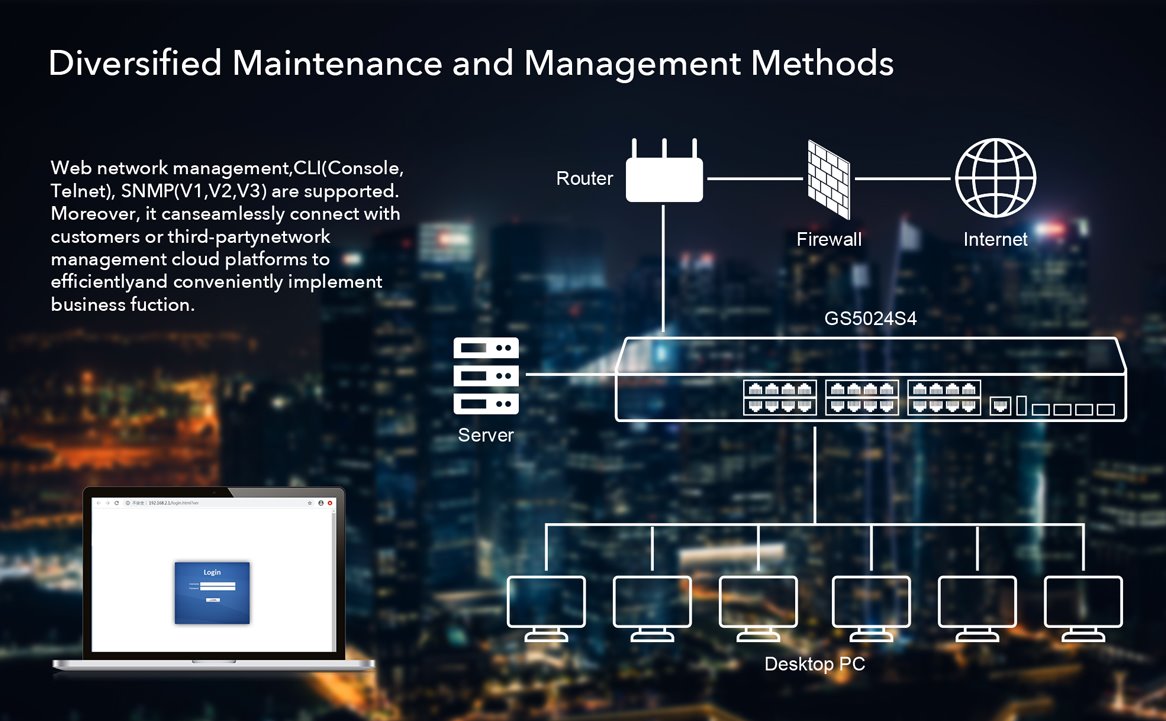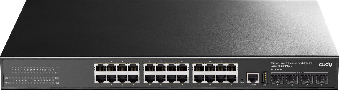 Accessový 19" rackmount switch s L3 funkcemi určený pro připojení klientů vaší sítě poskytuje (24) 10/100/1000 Mbps LAN portů a k tomu i (4) 10G SFP+ sloty zpětně kompatibilní s 1G moduly pro další rozšíření sítě pomocí optiky. Ke správě a monitoringu je možné využít běžný přístup přes webové rozhraní a protokoly např. CLI, SNMP, RMON, SSH i Telnet. Switch kromě standardních L2 funkcí jako je DHCP Snooping, VLAN, QoS, spanning tree, multicast, ling aggregation podporuje i L3 funkce - statické IPv4 i IPv6 routování.