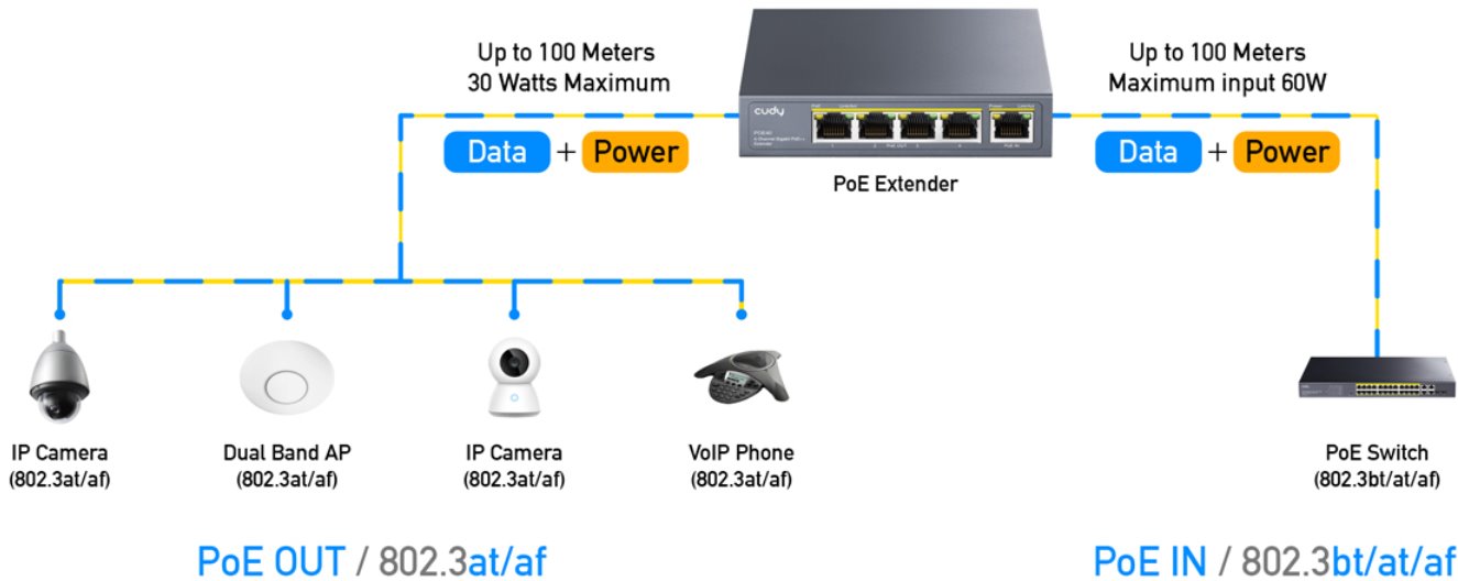 Gigabitový PoE switch v kovovém šasi, bez managementu s 5x Gigabit porty je ideální PoE switch do míst napájení pro napájení až 4 zařízení (kamer / Wi-Fi AP). Switch nabízí tichý bezventilátorový chod, 5x 10/100/1000 Mbps z čehož 4 LAN porty podporují funci PoE (802.3af/at, 30 W / port) s celkovým PoE budgetem 60 W. Tento switch se od ostatních odlišuje tím, že napájen pouze přes PoE-IN na posledním LAN portu pomocí 802.3af/at/bt adaptéru, který není součástí balení. Pro dostatečný PoE budget doporučujeme zdroj splňující 802.3bt standard.