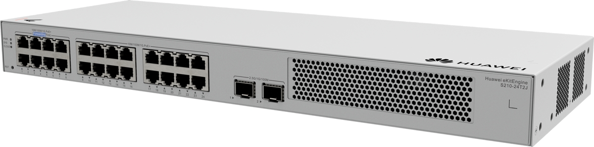 Huawei S210-24T2J je spolehlivý managovatelný cloud L2 switch s kapacitou přepínání 58Gbps, (24) Gbit porty a (2) 2.5G SFP sloty. Podporuje správu přes lokální webové rozhraní i cloudovou správu (eKit SNC / eKit mobilní aplikace). Maximální spotřeba energie zařízení je 18,9W.