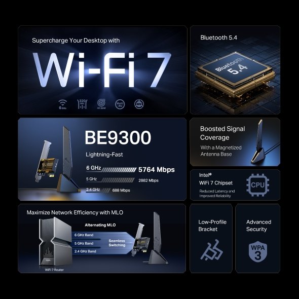 Pozvedněte bezdrátové připojení vašeho PC na novou úroveň. TP-Link Archer TBE553E je výkonná PCIe WiFi 7 karta s třípásmovou rychlostí až 9,3 Gb/s, podporou Bluetooth 5.4, flexibilními anténami a nejnovějším zabezpečením WPA3.