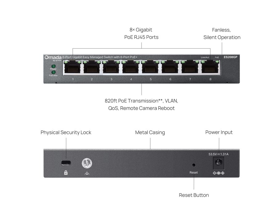 TP-Link ES208GP je snadno spravovatelný 8portový gigabitový switch s podporou PoE+ a celkovým výkonem 64 W. Je ideálním řešením pro napájení IP kamer, přístupových bodů nebo VoIP telefonů, a to díky podpoře Omada SDN a bezplatné cloudové správě Omada Cloud Essentials.