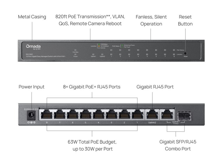 Switch TP-Link ES210GP 1x GLan, 8x GLan s PoE+, 1x SPF combo, 63W, Omáda SDN