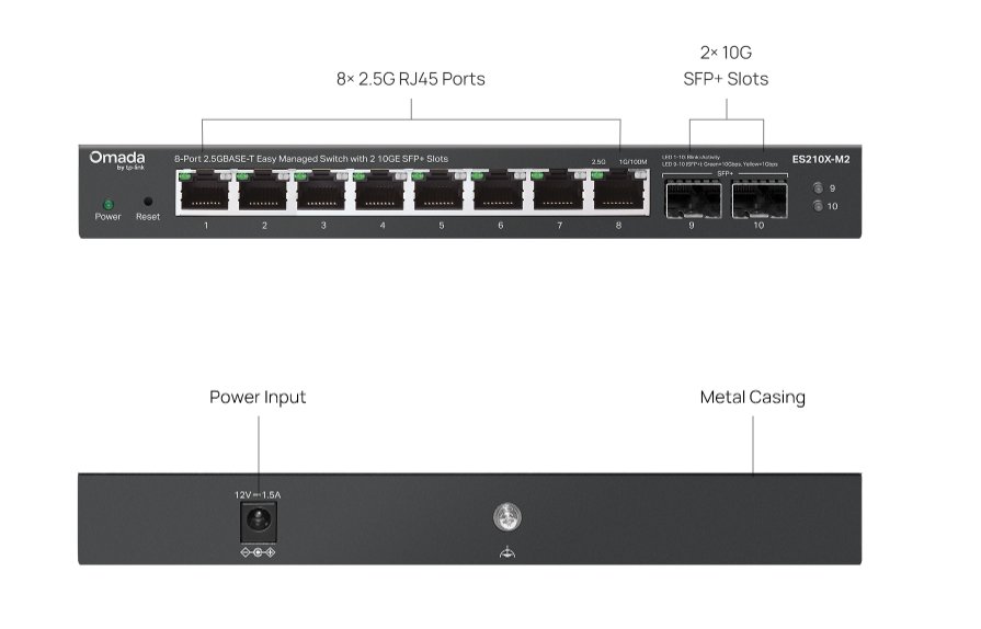 TP-Link ES210X-M2 je výkonný 2,5G multi-gigabitový switch s 10G SFP+ uplinkem, navržený pro moderní kanceláře, studia i domácí sítě s vysokými nároky na přenos dat. Díky 8× 2,5Gb/s portům a kapacitě přepínání 80 Gb/s zajistí maximální propustnost bez kompromisů.