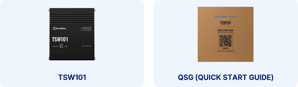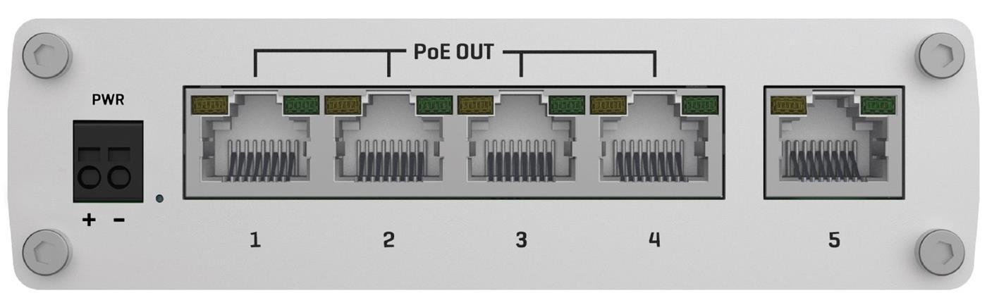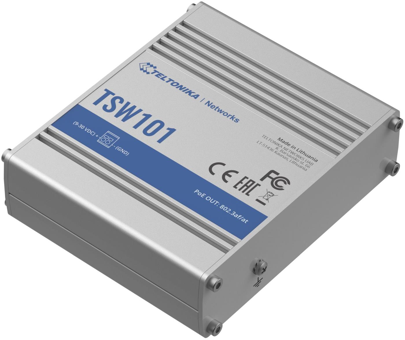 TSW101 je průmyslový PoE switch od Teltonika Networks s hliníkovým tělem, pasivním chlazením, bez managementu a po přikoupení kitu je možné switch nainstalovat i na DIN lištu. Zařízení nabízí 5 LAN portů s rychlostí 10/100/1000 Mbps a s podporou 802.3af/at PoE (30W/port) na prvních čtyrech portech s celkovým PoE budgetem 60W. Napájení je řešeno 2-pinovou svorkovnicí se vstupním napětím 9 až 30V.