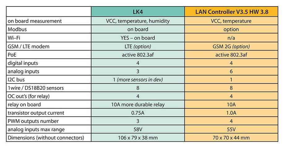 Můžete používat kabelové připojení Ethernet, bezdrátové připojení Wi-Fi (802.11n), nebo obojí současně. K dispozici je také LTE připojení. LAN ovladač lze plně konfigurovat z webové stránky, která je k dispozici na vestavěném webovém serveru. Do zařízení je také možné posílat libovolné příkazy prostřednictvím protokolu HTTP (s vynecháním webové stránky) nebo MQTT (po konfiguraci připojení).