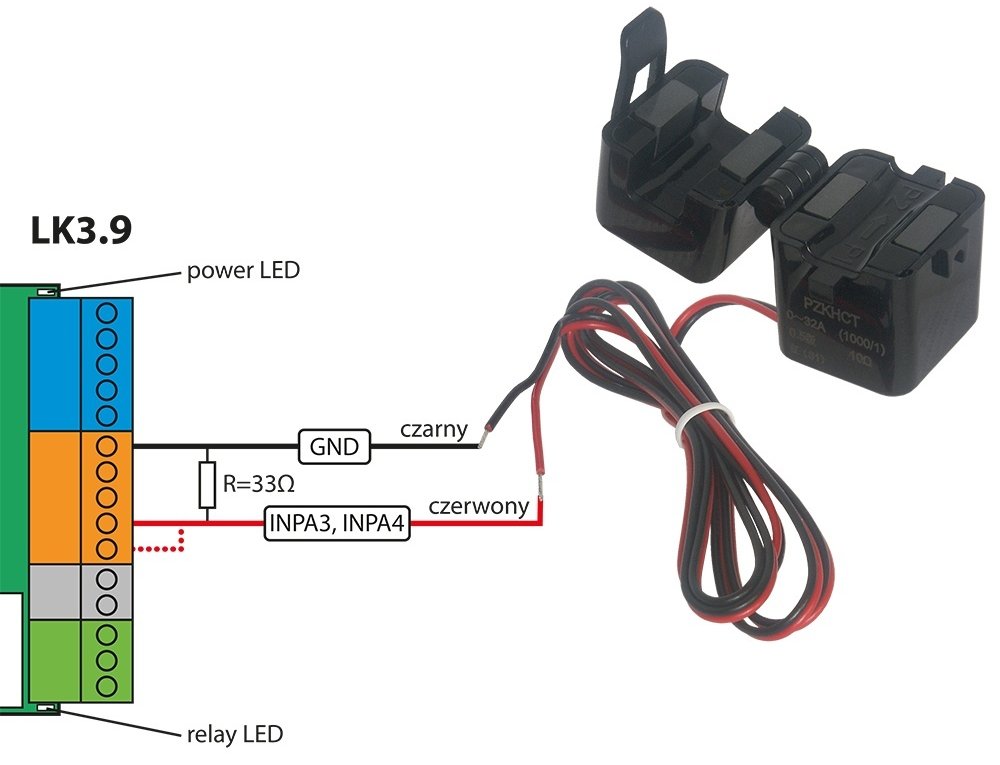 Zařízení je dodáváno s 33Ω rezistorem pro přímé použití s 3,3V analogovými vstupy systémů LK. Průměr otvoru 11 mm s vysokou izolací umožňuje bezpečnou montáž na běžná elektrická vedení.