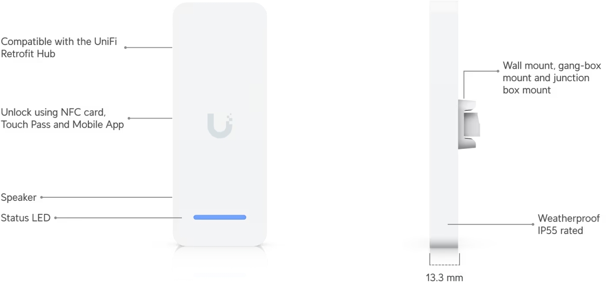Ubiquiti UniFi Access UA-Retrofit-Reader-W je bezkontaktní čtečka NFC karet určená pro použití s UA-Retrofit-Hub-2 a možností řetězového zapojení až 2 čteček na jedny dveře. Pro komunikaci s hubem využívá zabezpečený protokol OSDP v2 přes rozhraní RS-485.