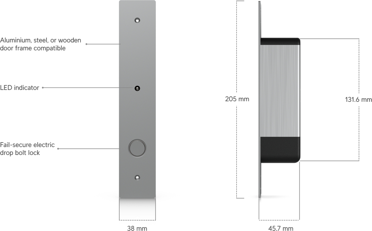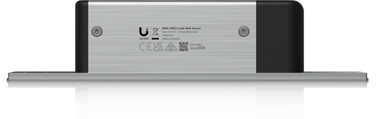 Ubiquiti UACC-Lock-Bolt-Secure je bezpečnostní elektrický západkový zámek určen k propojení s UniFi Access Hub. Zámek je typu fail-secure, při selhání zůstane uzamčen. Může být nainstalován do dřevěných, ocelových i hliníkových rámů. Zařízení je vybaveno vestavěným DPS (senzorem polohy dveří), který umožňuje monitorování stavu otevření/zavření dveří. Napájení je přes třížilovou svorkovnici 12V/600mA.