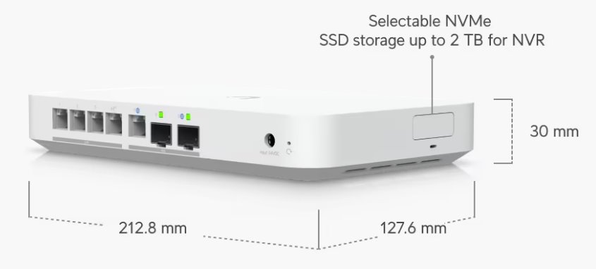 Pomocí integrované aplikace UniFi Network dokážete spravovat až 50+ UniFi zařízení a obsloužit až 500+ připojených klientských zařízení. Pro ukládání video záznamu z kamer je možné router doplnit o NVMe SSD až do velikosti 2TB díky připravenému slotu. Nechybí stavový displej o velikosti 0,96". Napájení je řešeno prostřednictvím napájecího adaptéru 54V/1,1A, napájecí adaptér je součástí balení.
