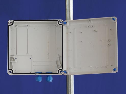 - vlastní box s předvrtanými otvory pro 2 kabelové průchodky