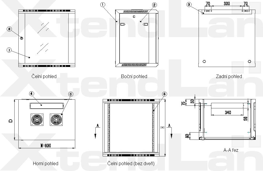 XtendLan 6U/600x450, na zeď, jednodílný, skleněné dveře